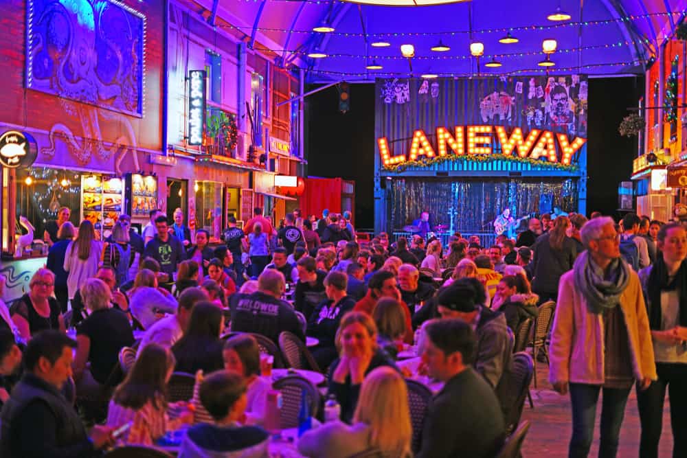 Vista nocturna de “Eat Street”, este es un mercado de comida al aire libre que está ubicado en contenedores a las orillas del río en la ciudad de Brisbane, Queensland, Australia. “Eat Street Northshore” es una fiesta en todos los sentidos: los paisajes, los olores, los sabores y los sonidos cobran vida en este pueblo de contenedores de comida todos los viernes, sábados y domingos por la noche. Existen muchas opciones gastronómicas, ya que Australia es la puerta de entrada culinaria hacia toda la zona del este.
