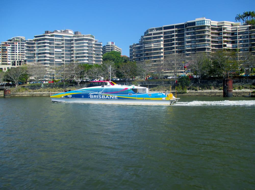 CityCat, el sistema de transporte público que es un emblema de la ciudad de Brisbane y que está ubicado en el río Brisbane Queensland con West Bank en el fondo.